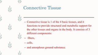 This document provides information on connective tissues and muscle tissues. It discusses the components and types of connective tissue, including collagen, elastic, and reticular fibers. It also describes the cells found in connective tissue. Special staining techniques for demonstrating these tissues are outlined, including Masson's trichrome, Gomori's trichrome, van Gieson's, and Verhoeff's elastic stains. The document also briefly describes the three types of muscle tissue - skeletal, cardiac, and smooth muscle.