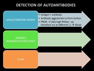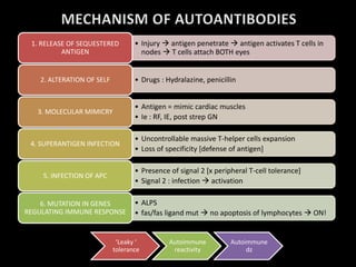 This document discusses several potential mechanisms that can lead to autoimmune diseases, including the release of sequestered antigens, molecular mimicry, superantigen infection, and mutations in genes regulating the immune response. It also provides an overview of different types of hypersensitivity reactions (types I-IV) and lists some common organ-specific and non-organ-specific autoimmune diseases. Finally, it briefly touches on epidemiology, etiology, clinical features, investigations, and management of systemic lupus erythematosus.