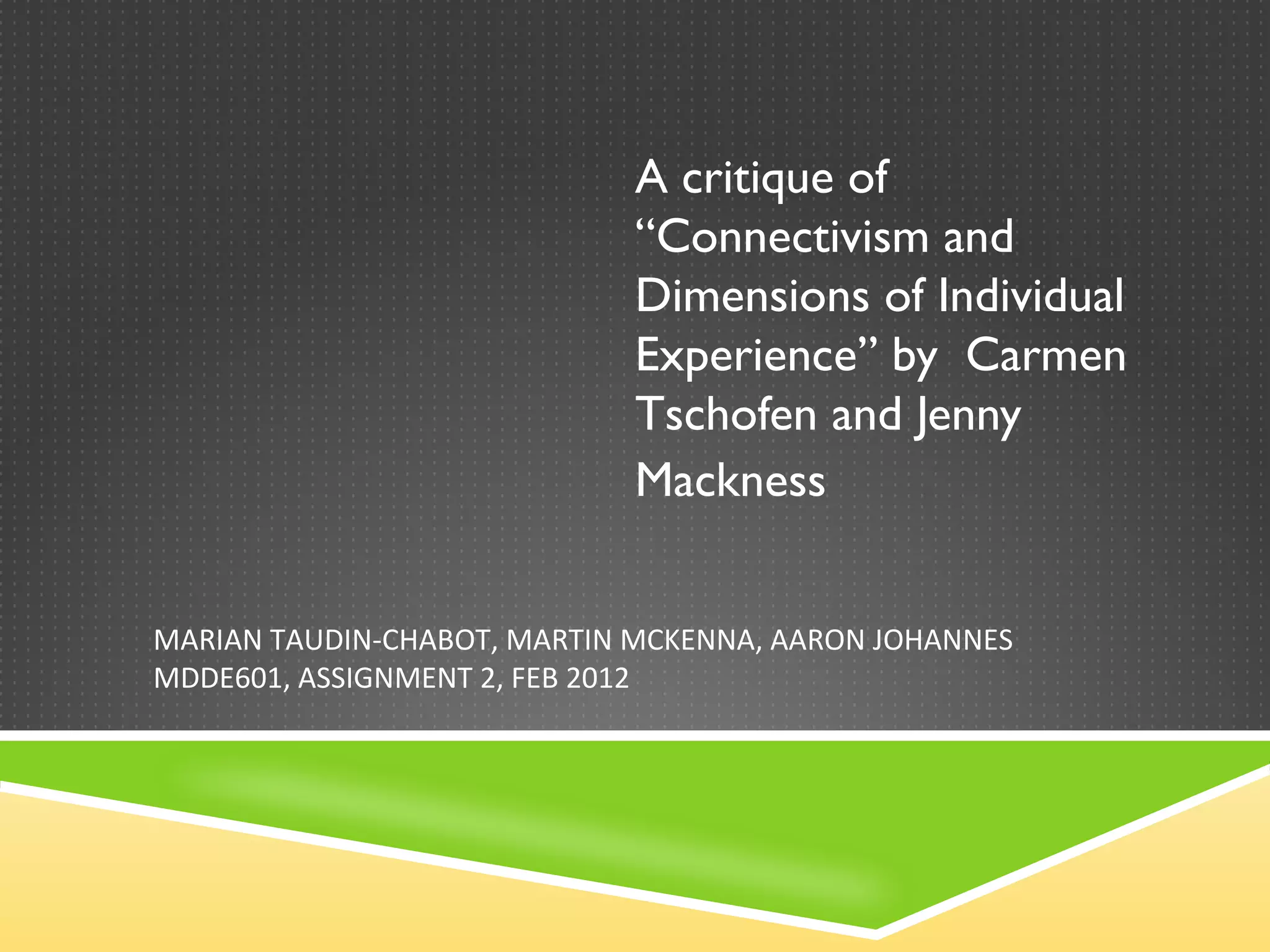 This article provides a critique of the paper "Connectivism and Dimensions of Individual Experience" by Carmen Tschofen and Jenny Mackness. It summarizes the key themes of connectivism explored in their paper, such as autonomy, connectedness, diversity and openness. It also discusses some of the tensions identified between these connectivist ideals and the realities of individual experience in MOOCs. However, the critique finds the original paper difficult to understand for those unfamiliar with MOOCs and connectivism concepts due to its use of jargon and limited research scope.