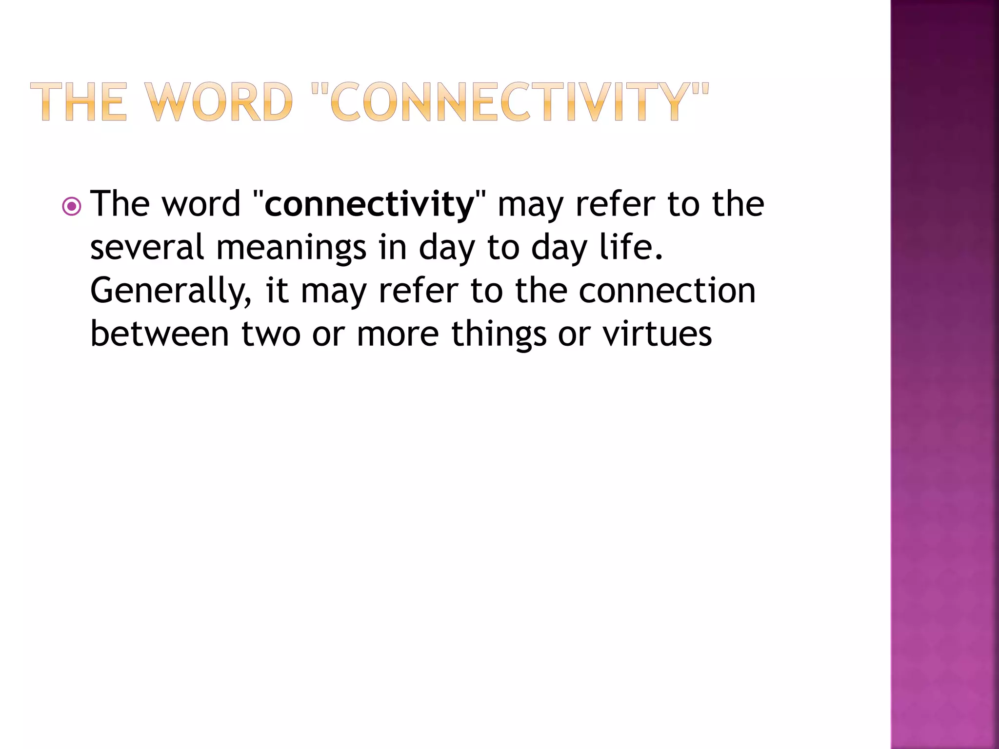 The document discusses various concepts related to connectivity in graphs. It defines what makes a graph connected versus disconnected. Key points include: a connected graph has a path between all vertex pairs; removing vertices or edges can disconnect a graph; connected components are maximal connected subgraphs; cut vertices and edges disconnect the graph when removed. Graph isomorphism is also discussed, where two graphs are isomorphic if their adjacency matrices are identical.