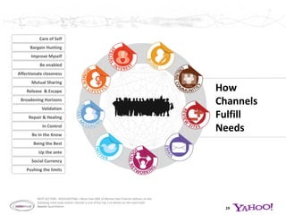 The document explores the needs of women and how online channels can effectively address these needs through various research methods, including interviews and surveys. It emphasizes the complexity of women's lives and their desire for personal growth and connection, suggesting that marketers must understand these dynamics to engage effectively. By leveraging specific online platforms, marketers can meet women's needs for validation, emotional satisfaction, and information sharing.