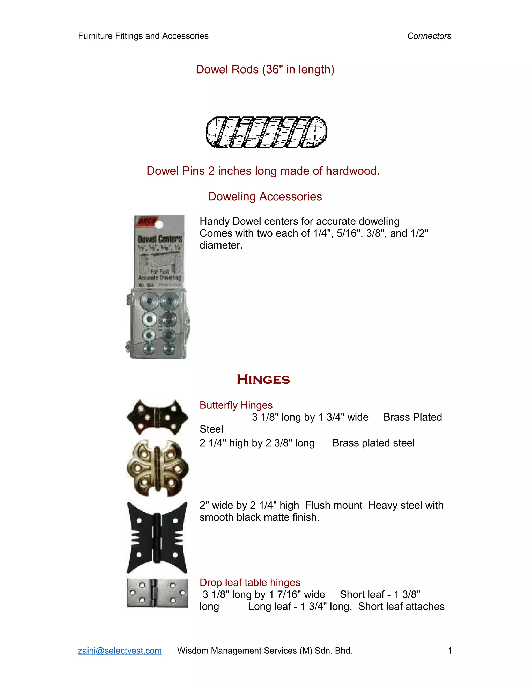 The document lists various types of furniture fittings and accessories including dowel rods, dowel pins, dowel centers, butterfly hinges, flush mount hinges, drop leaf table hinges, concealed hinges, hinges, strap hinges, pivot hinges, lift off hinges, trunk hinges, ice box hardware, trunk lid stays, rollers, studs, trunk locks, drawbolts, and catches. The items are made of materials like hardwood, brass, steel, and bronze. Sizes vary with the specific fitting or accessory described.