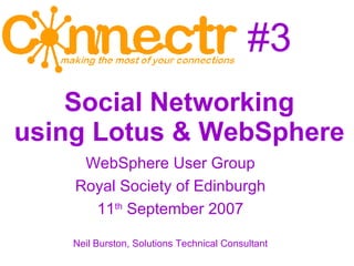 The document discusses social networking using Lotus and WebSphere. It describes IBM Lotus Connections, a set of social software tools for businesses that include profiles, communities, blogs, bookmarks and activities. It also discusses how Lotus Connections uses open standards and REST APIs to make it extensible. Finally, it talks about best practices for adoption, including running pilots, defining adoption plans and identifying evangelists to encourage use of social networking within an organization.