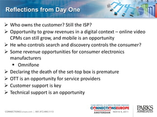 The document provides reflections from the first day of a conference. It discusses opportunities for internet service providers (ISPs) to grow revenues through online video advertising and mobile services. It questions whether ISPs still own customers or if search engines now control consumer discovery. It also sees opportunities for consumer electronics manufacturers in services like Omnifone. While some declare the set-top box dead, the document thinks it is premature. It views over-the-top (OTT) services as an opportunity for service providers and emphasizes that customer and technical support will be important.
