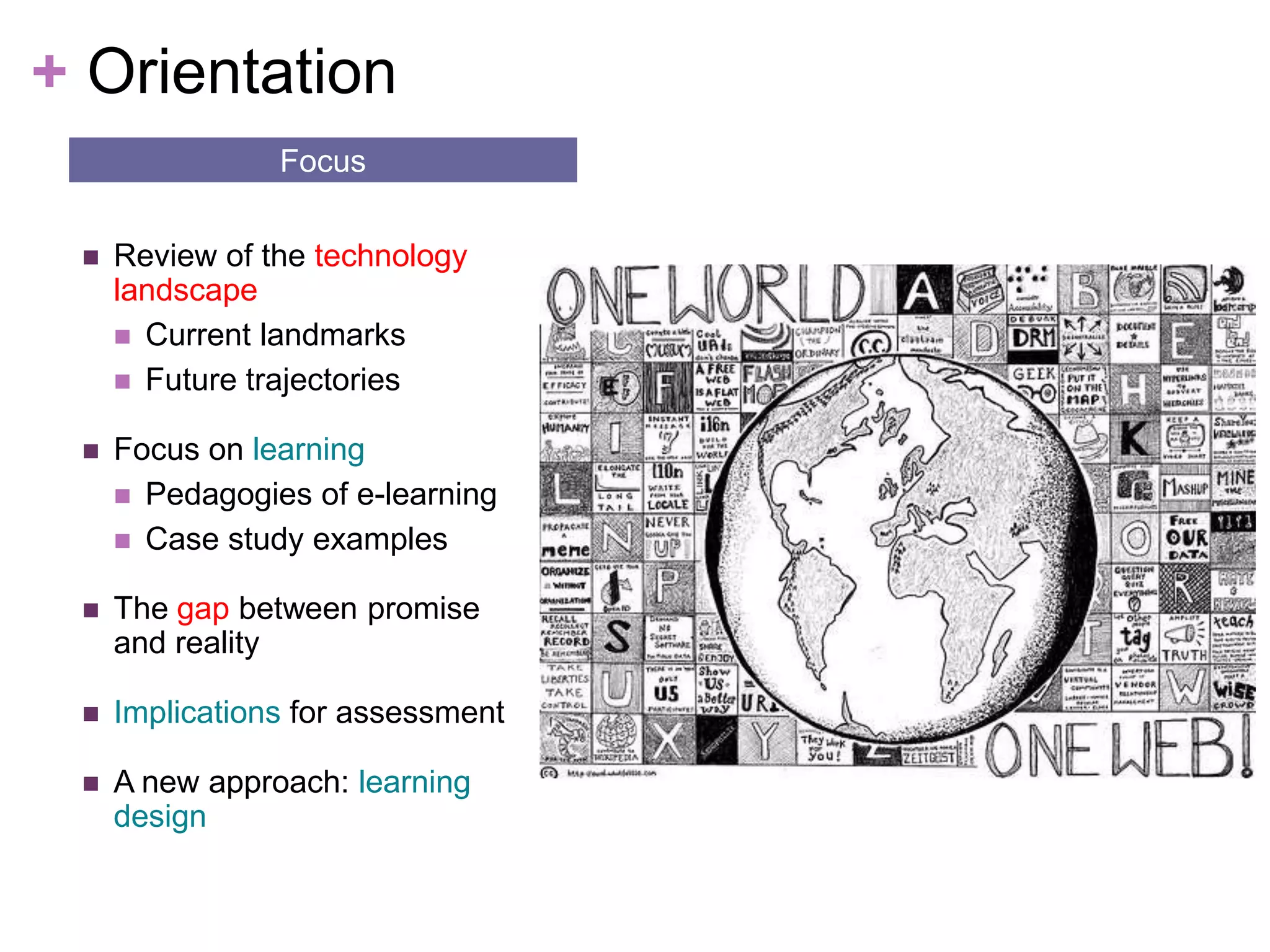 New social and participatory media are changing assessment practices by enabling sharing, communicating, and interacting in new ways. Assessments need to move beyond individual knowledge recall to evaluate collaboration, reflections, problem-solving and digital literacy skills. A learning design approach can help translate new pedagogies enabled by technologies into tailored pathways and resources, while tools like Cloudworks support sharing and discussion. Overall, the boundaries between formal and informal learning are blurring and new approaches are needed to navigate this complex digital landscape.
