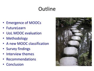 The document discusses a study evaluating Massive Open Online Courses (MOOCs). It provides background on the emergence of MOOCs and different types (cMOOCs and xMOOCs). The study evaluated two MOOCs on the University of Leicester's FutureLearn platform using surveys, interviews, and analytics. Key findings included that over 50% of participants had prior MOOC experience, most visited courses a few times per week, and 91% had a positive experience. Recommendations focused on strategic course selection, learner support, analytics use, and exploring business models.