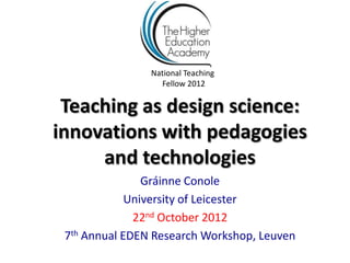 This document summarizes Gráinne Conole's presentation on teaching as a design science. It discusses how teaching can benefit from an evidence-based and creative design approach using learning design methodology. Conole outlines technological trends in education and challenges in teacher practice. She presents learning design as a way to promote reflection and encourage the sharing of teaching designs and resources. The presentation argues that disaggregation of education through open educational resources allows for more flexible learning pathways.