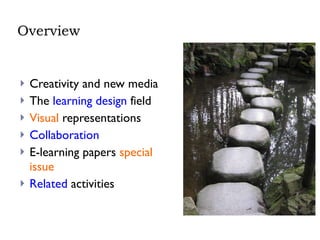 The document discusses learning design as a field of research and practice. It defines learning design as a methodology for making the learning design process more explicit and shareable. It outlines how learning design encourages reflective practices, promotes sharing of designs, and shifts approaches from implicit to explicit. Visual tools and collaboration allow designers to represent and discuss their learning designs.
