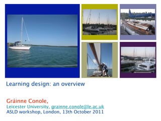 The document discusses learning design methodology, which is a pedagogically informed approach to making the instructional design process more explicit and shareable through tools and visualizations, with the goal of helping educators make more informed decisions about course design and encouraging reflective practice and collaboration through communities. It outlines the foundations of learning design in activity theory and mediating artifacts and how tools have co-evolved with practices.