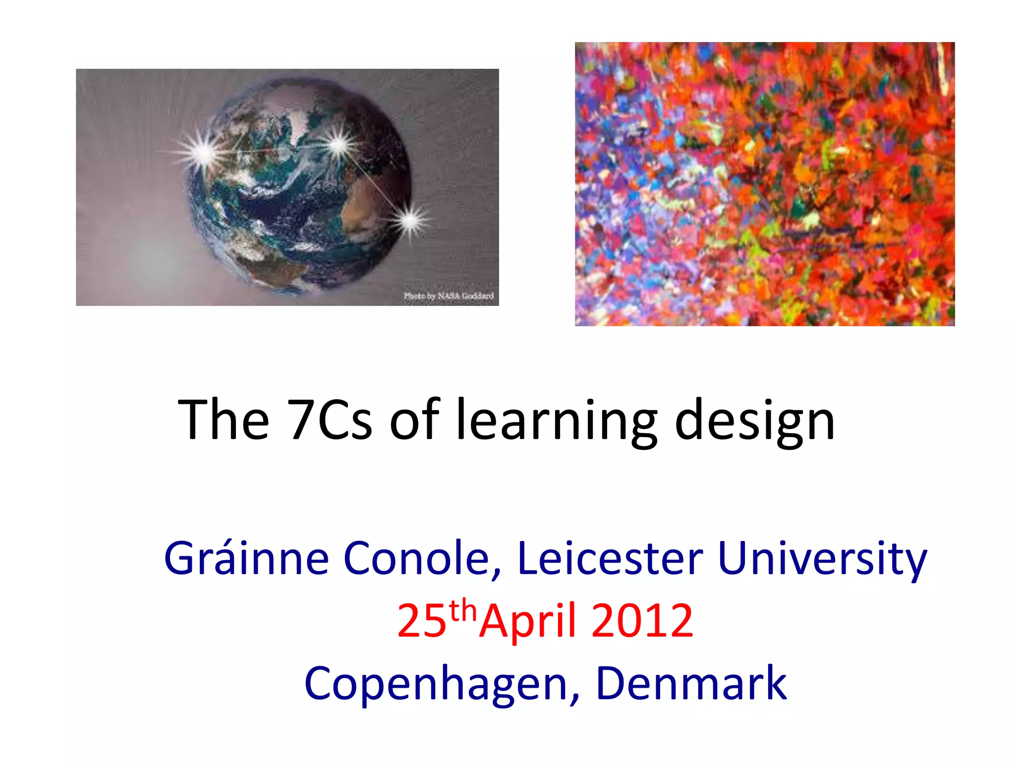 The document discusses the 7Cs of learning design, which are a framework to help conceptualize, create, communicate, and consolidate effective course designs. It outlines the 7Cs as conceptualize, communicate, consider, create, collaborate, consolidate, and continue. The document then provides an example agenda and activities for a workshop to help educators learn and apply the 7Cs of learning design to their own courses through reflective exercises like developing course features, maps, resource audits, activity profiles, and storyboards.