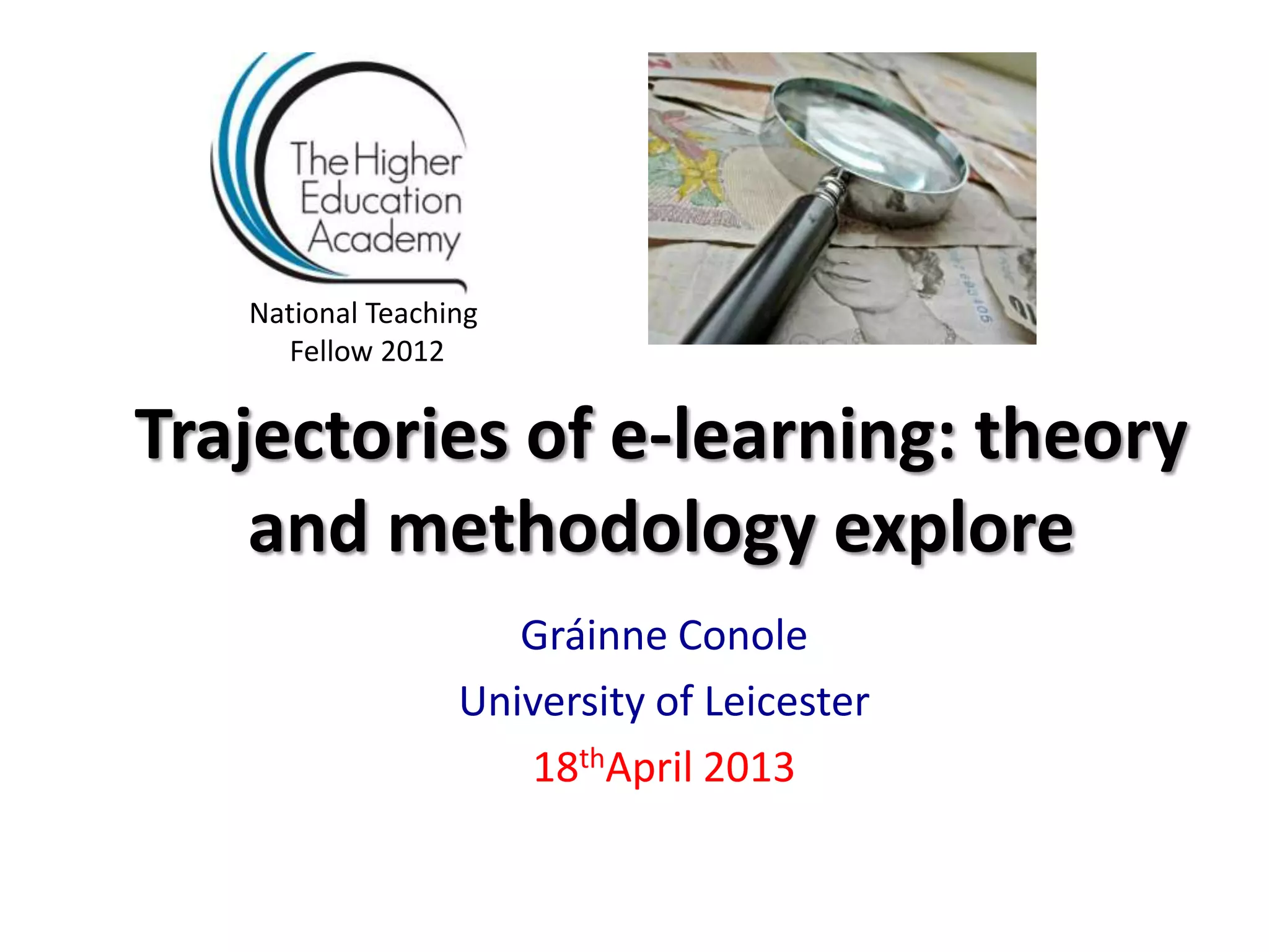 National Teaching Fellow 2012 Gráinne Conole gave a presentation on trajectories of e-learning theory and methodology. She discussed emerging technologies for e-learning, approaches such as social network analysis and actor network theory to study online interactions, and learning design frameworks including activity theory and design-based research. Conole argued that research in this area must account for the complexity, diversity and evolving nature of e-learning practices.