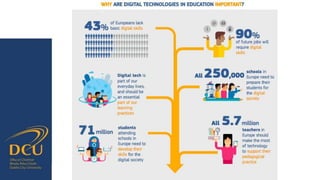 Gráinne Conole gave a presentation on key trends and implications for the future of technology enhanced learning. She discussed 10 top trends including how digital technologies are shifting identities, boundaries, and ownership of information. She emphasized that effective pedagogy depends on understanding learners, educators, and the learning environment. New approaches to learning design and analytics were presented as opportunities to improve teaching and learning, but continuous professional development for educators is needed to develop digital literacies and harness technology's potential. While technology affords many opportunities, its impact depends greatly on implementation and mindsets around educational change.