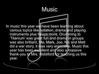 In music class this year, the student learned about music notation, drama, and playing instruments. Their highlights included drumming to "Titanium" and performing a war story in a drama group. In Italian class, they studied the Olympics, Tuscany, and other topics. Learning about Tuscany was especially interesting since the student previously knew little about the region. For math class, the student practiced addition, subtraction, multiplication, and division, and their highlights included making mocktails and learning about the stock market. The student also enjoyed various sports played in P.E. such as soccer, cricket, and basketball. They thanked all their teachers for a great year of learning.