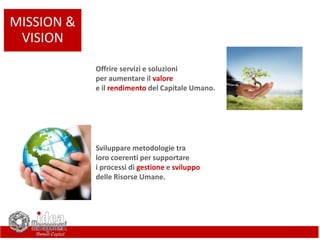 Il documento presenta le metodologie e i percorsi offerti da Ideamanagement per migliorare la gestione del capitale umano, enfatizzando l'importanza dell'assessment e dello sviluppo delle competenze chiave. Viene descritto un approccio integrato per misurare e gestire le capacità all'interno delle organizzazioni, sottolineando l'evoluzione delle tecniche di assessment dagli anni '80 a oggi. Inoltre, il bilancio delle competenze è presentato come uno strumento cruciale per mettere a valore il know-how e supportare i processi di selezione e formazione.