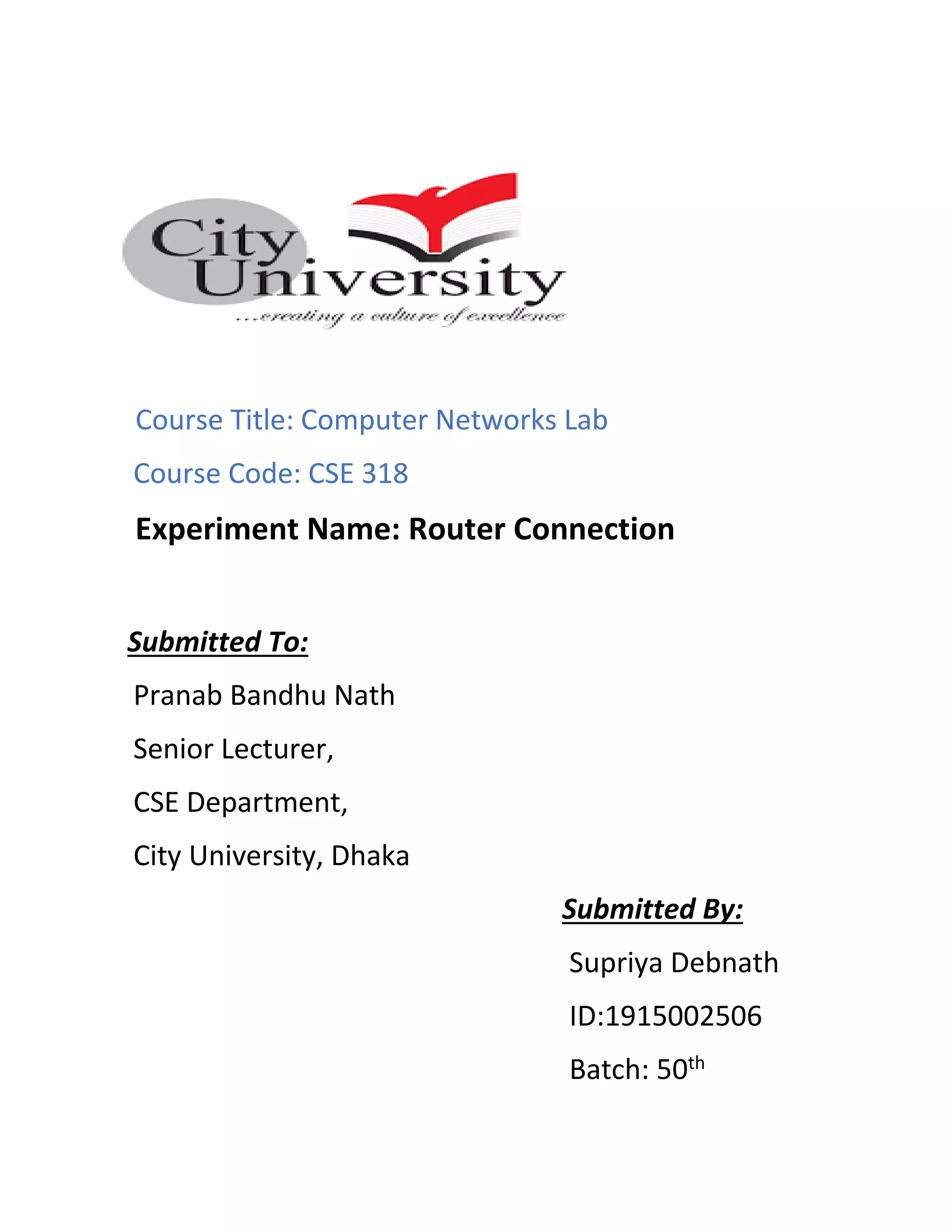 The document is a lab report submitted by Supriya Debnath for their Computer Networks Lab course. The report describes Experiment 10 which involved connecting a computer, two switches, and a router using copper straight-through connections in Packet Tracer to study router connections. The connections were made according to the provided diagram and the result of the experiment is included in the report.