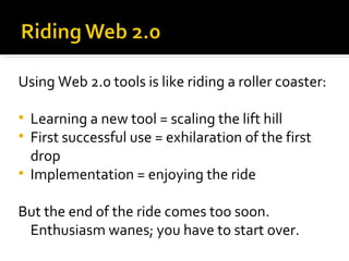 The document discusses the benefits and challenges of using Web 2.0 tools in education. It describes how these tools can promote collaborative and constructivist learning, as well as prepare students for the workplace. However, these tools also have downsides like a steep learning curve, unreliability, and changing interfaces. The document provides recommendations for effectively integrating these tools, such as choosing versatile ones, simplifying use, and collaborating with other educators.