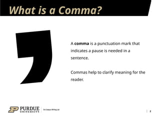 The document provides an overview of comma usage, highlighting its importance in clarifying sentence structure and meaning. It distinguishes between independent and dependent clauses, essential and non-essential phrases, and outlines rules for punctuating compound and series sentences. Additionally, it addresses common punctuation errors such as comma splices and offers guidance on how to correct them.