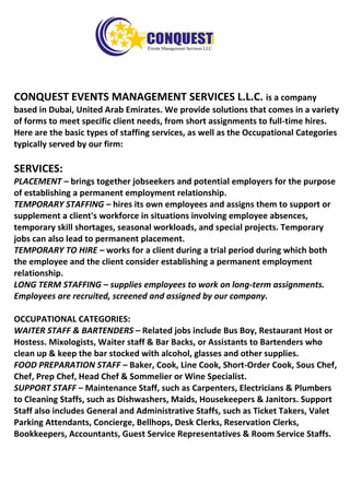 Conquest Events Management Services L.L.C., based in Dubai, offers various staffing solutions, including placement, temporary staffing, and long-term assignments, catering to diverse occupational categories such as food preparation, support staff, and management. The company serves clients across multiple industries and hires employees from various nationalities, including Filipino, Indian, and Arab. For inquiries, potential clients can contact the managing director, Abdur Rahman, at the provided phone numbers or email.