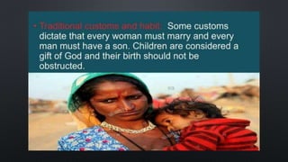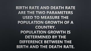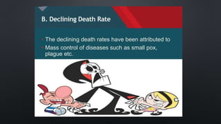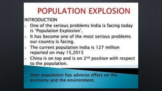 The document discusses the effects of population explosion, defined as a sudden increase in the number of individuals in a specific area over time. Population explosion has serious impacts on the environment, commerce, education, and psychology. It is a cause of concern as its effects are already being seen in many areas due to sudden population increases. The document notes that population explosion has various causes and proposes some potential remedial measures should be taken.