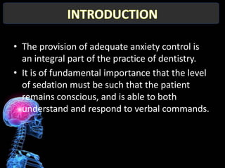 The document discusses guidelines for providing conscious sedation for dental procedures. It emphasizes that conscious sedation requires patients remain conscious and responsive during treatment. It provides guidance on appropriate sedation techniques for different ages, health statuses, and procedures. The document also outlines pre-operative, intra-operative, and post-operative protocols to ensure patient safety and proper recovery monitoring.