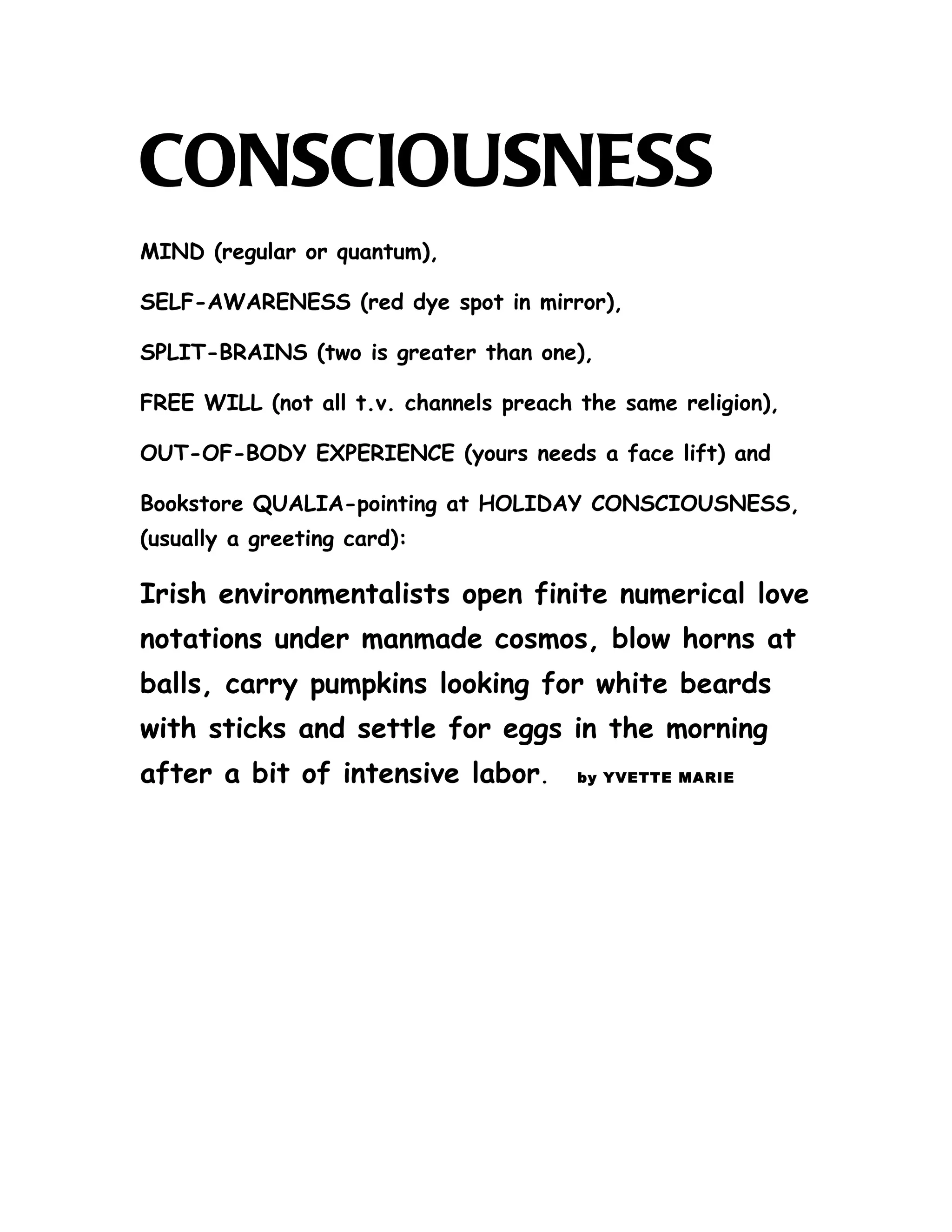 The passage discusses various aspects of consciousness such as the mind, self-awareness, split-brains, free will, and out-of-body experiences. It also references qualia and holiday consciousness as seen in a bookstore, mentioning Irish environmentalists, love notes, the cosmos, horns, pumpkins, beards, sticks, and eggs in the context of labor.