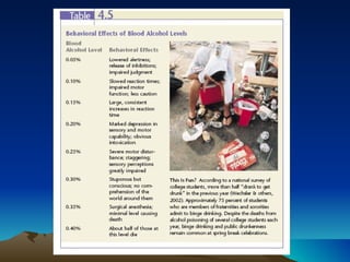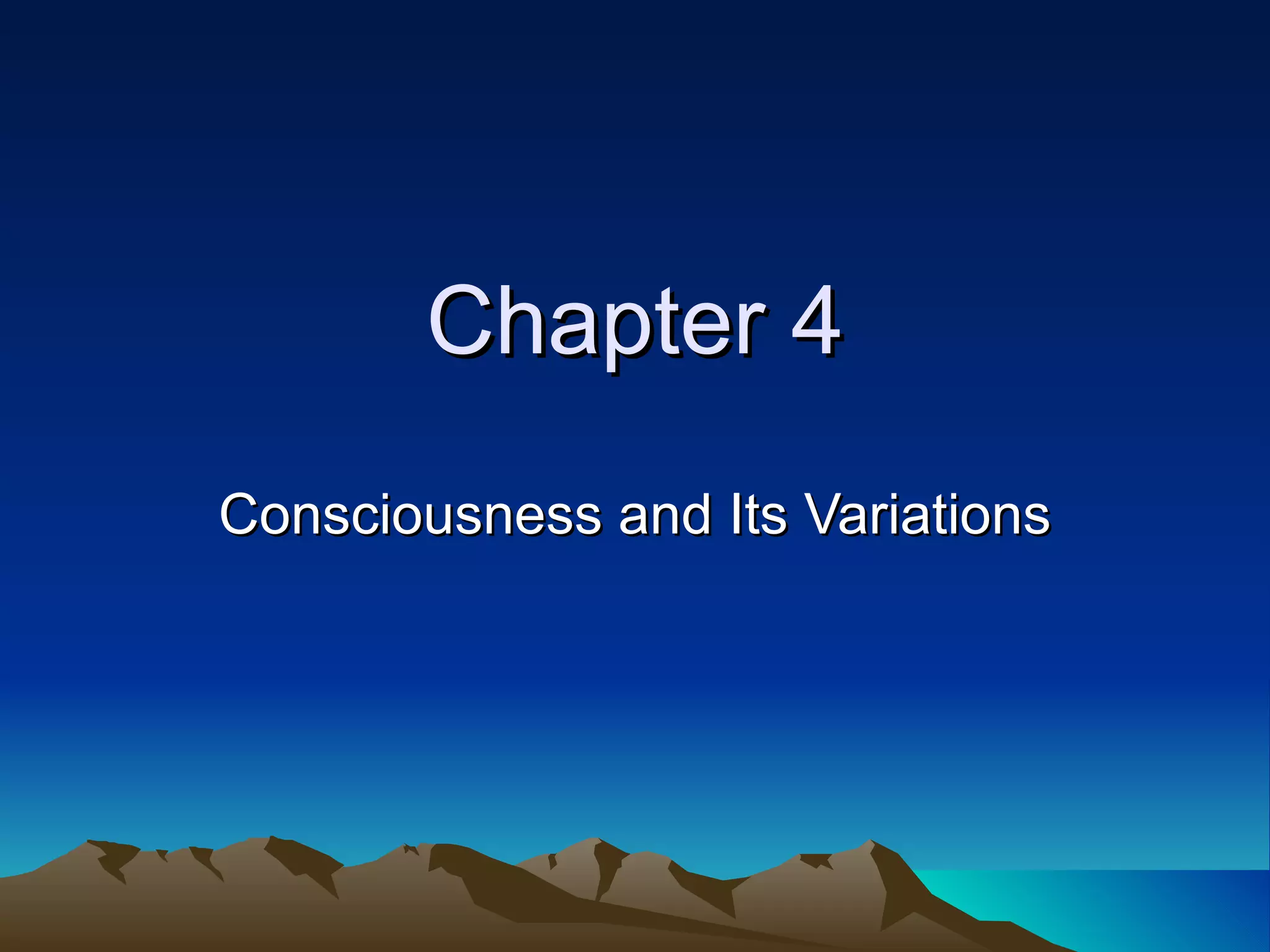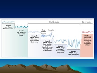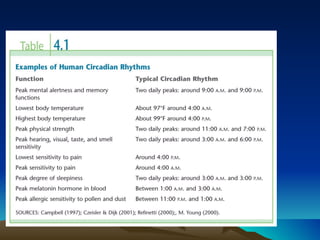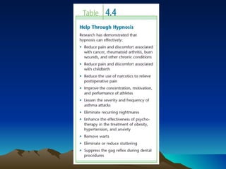 This chapter discusses consciousness and various states of consciousness. It covers circadian rhythms and the body's biological clock. There are different stages of sleep characterized by different brain wave patterns, as well as sleep disorders. Dreams occur during REM sleep and there are different theories about their meaning and purpose. Other topics covered include hypnosis, meditation, psychoactive drugs and their effects, and drug abuse.