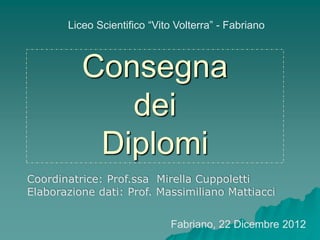 Il documento presenta un'analisi della situazione degli studenti diplomati nel liceo scientifico "Vito Volterra" di Fabriano dal 2004 al 2012, con focus sulla scelta delle università e delle aree di studio. Viene evidenziato il numero di diplomati, iscritti e laureati negli anni, nonché le percentuali e le tendenze nelle scelte universitarie degli studenti. Infine, il documento elenca i nomi degli alunni diplomati suddivisi per classe nell'anno scolastico 2011/2012.