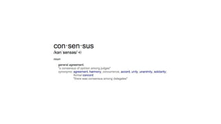 This document discusses redefining decision making and moving away from consensus-based models. It argues that public consensus is not possible without oppression, and that focusing on individual gut feelings and intentions on a daily basis, rather than trying to reach group consensus on ideas, could be a better foundation for decision making. It also questions interpretations of feminist history that emphasize the development of consensus processes, suggesting the capabilities and imagination of the time may have led to misunderstandings. Overall, it advocates disengaging from consensus and giving people freedom and trust to change their minds freely without having to defend or sell ideas to others.