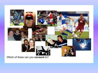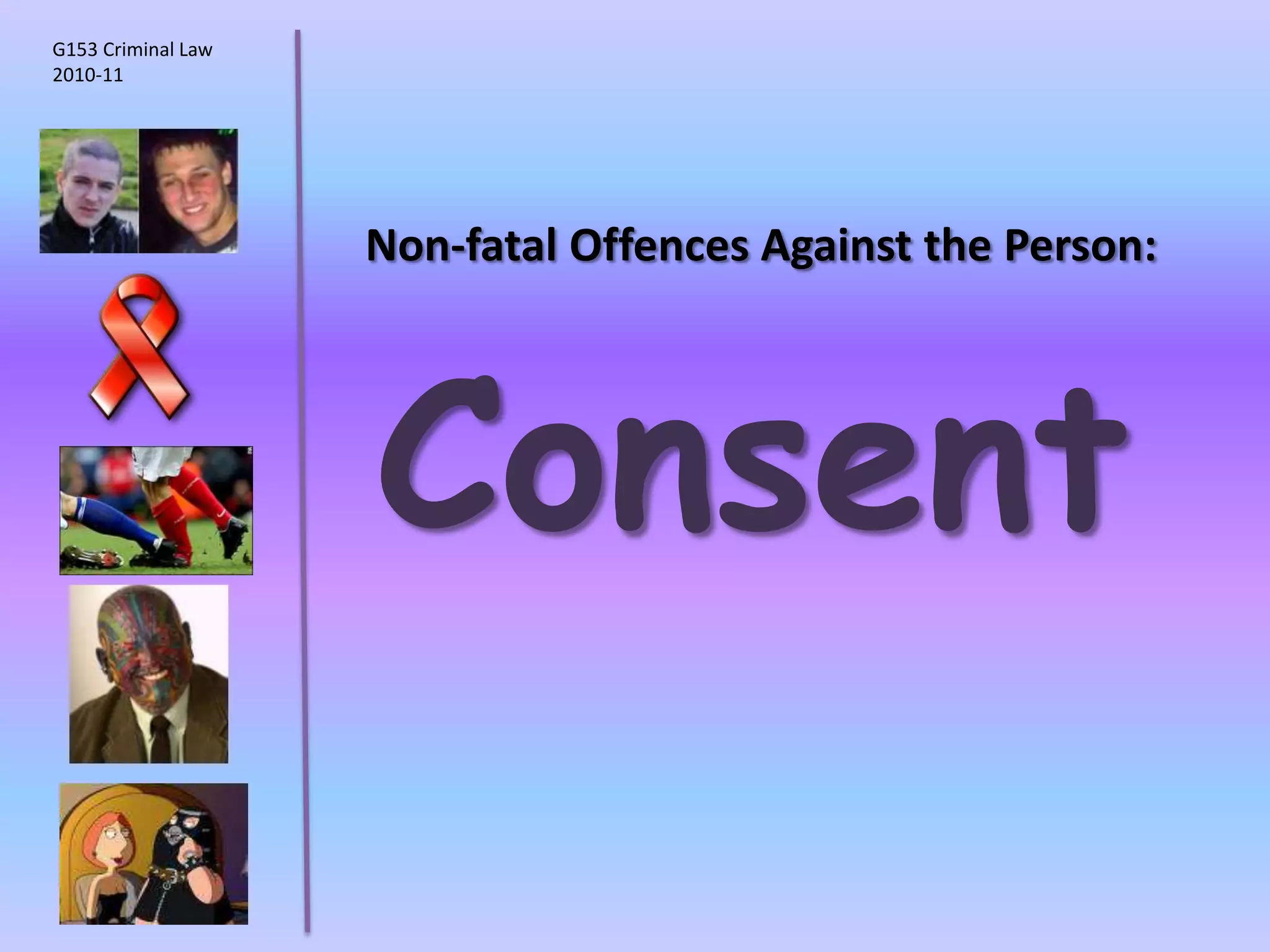 The document discusses the law around consent as a defense for offenses against the person. It provides an overview of key cases that have established rules and exceptions regarding consent. It also presents a hypothetical scenario from another jurisdiction to analyze whether consent could be a valid defense for intentionally causing harm. The document aims to assess students' existing knowledge and guide them in improving essay responses through highlighting cases, legal rules, and evaluating the development and impact of reforms.