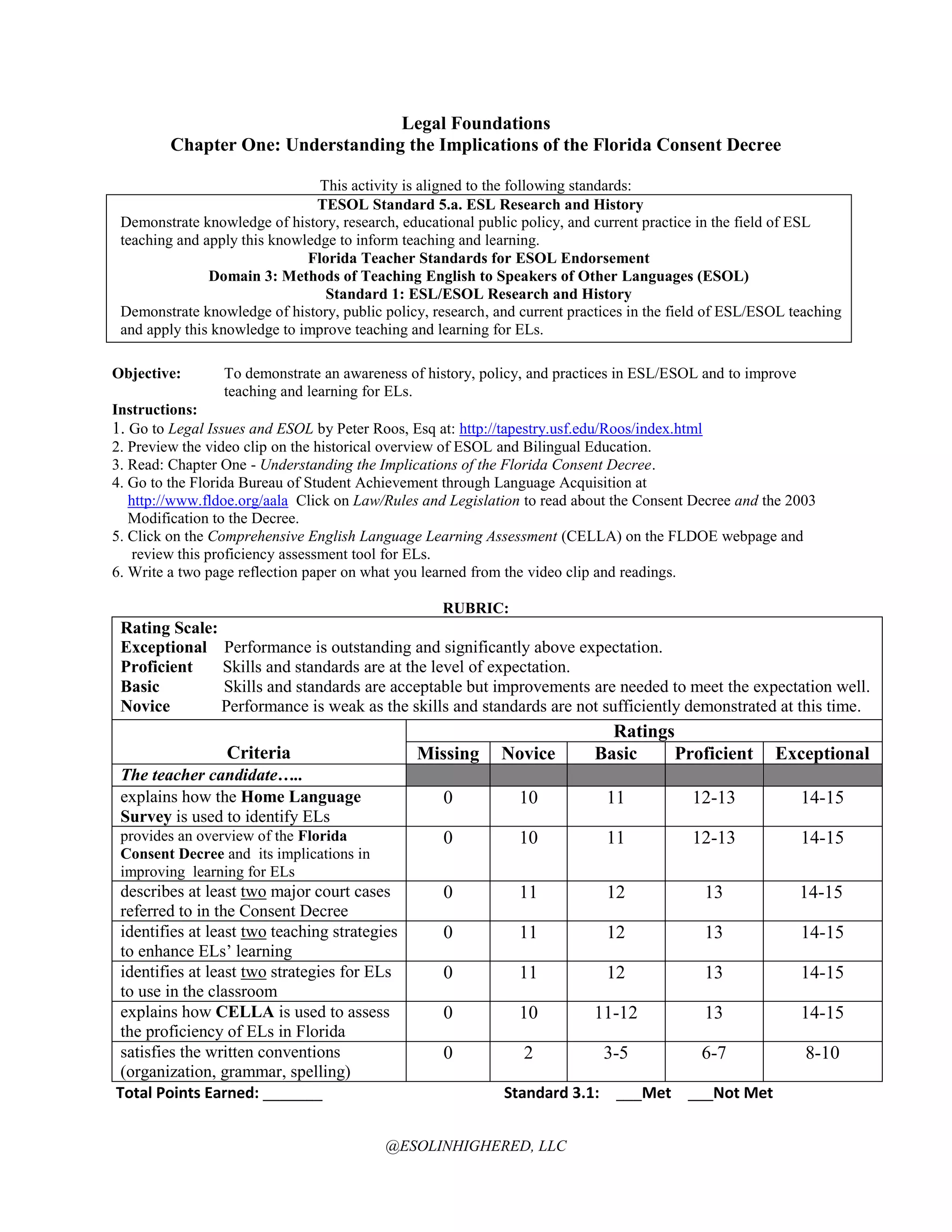 The document provides instructions for an activity to demonstrate an awareness of the history and policies regarding English as a Second Language (ESL) education in Florida. Students are asked to review a video and readings on the Florida Consent Decree, which settled two major court cases regarding the education of English Learners (ELs). They are also to review the Comprehensive English Language Learning Assessment (CELLA), which is used to assess EL proficiency in Florida. Students then must write a two-page reflection paper discussing what they learned about how the Consent Decree has improved teaching and learning for ELs. Their paper will be evaluated based on a rubric assessing their explanation of the Home Language Survey, overview of