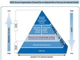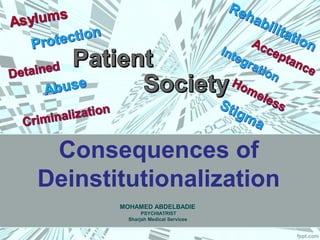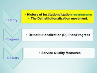 This document discusses the history of deinstitutionalization of mental health services. It describes how large psychiatric hospitals were gradually replaced by community-based services starting in the 1950s due to factors like new medications, poor conditions in hospitals, and civil rights movements. However, deinstitutionalization has faced challenges including shortages of beds and community services in many places. There is no consensus on optimal numbers of psychiatric beds, but most experts estimate around 39 beds per 100,000 people. Outcomes of deinstitutionalization like rates of homelessness, suicide, and crime are complex to assess with no clear relationship to number of beds or other services. The document concludes that an individualized, integrated approach within healthcare is better than traditional facilities