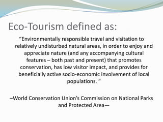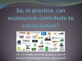 Ecotourism has the potential to contribute financially to conservation efforts through tourism revenue generation and by increasing environmental awareness, but its impacts depend on how it is implemented. A meta-analysis of 188 ecotourism case studies found that 62.8% were considered ecologically sustainable. Factors correlated with sustainability included local community involvement, habitat type (tropical forests and savannahs more suitable), and study methodological rigor. Sustainability was negatively correlated with projects in Africa, Asia, and Central America. For ecotourism to effectively support conservation, local communities must be involved in planning, visitor numbers must be limited, and national legal support is needed.