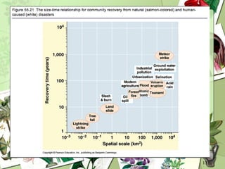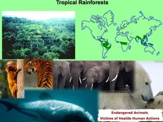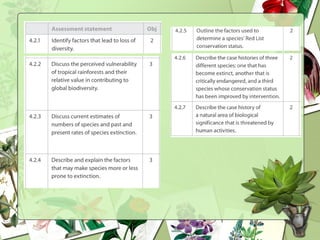 The document discusses factors that lead to loss of biodiversity such as introduced species, natural hazards, agriculture, habitat degradation, pollution, and hunting. It then evaluates characteristics that make species more vulnerable to extinction, such as being habitat specialists, having low reproductive rates, large body size, low population densities, narrow geographic ranges, and small/declining population sizes. The International Union for Conservation of Nature (IUCN) Red List highlights species at higher risk of extinction based on population trends, geographic distribution, habitat quality and other factors.