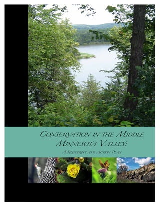 This document presents a conservation blueprint and action plan for the Middle Minnesota River Valley. It identifies the valley's important natural and cultural resources that have developed over thousands of years and were shaped by climate, fire, grazing and Native American inhabitants. The plan establishes conservation priorities and strategies to protect these resources in the face of threats like habitat loss and fragmentation. The strategies include land acquisition, easements, restoration and education to reconnect habitat blocks while providing recreational opportunities that support ecotourism and the local economy. The plan aims to balance resource conservation with public use for current and future generations.