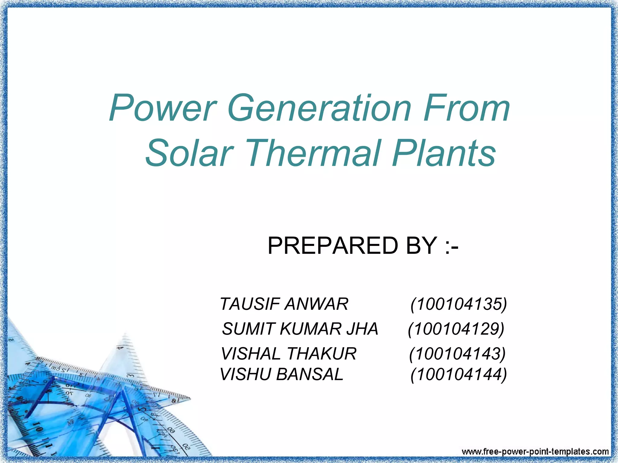 This document discusses power generation from solar thermal plants. It describes how solar thermal energy collectors are classified as low, medium, or high temperature based on their use. Low temperature collectors are used to heat pools, medium for water and air heating, and high temperature concentrate sunlight for electricity production. Heat is collected, stored, and transferred for power generation during the day and at night. Conversion rates from solar to electrical energy are highest for dish/Stirling systems at 31.25% and around 20% for trough and Fresnel systems. Applications include residential and commercial water and space heating.
