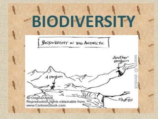 This document discusses biodiversity conservation. It outlines factors threatening biodiversity like human population growth and climate change. It describes ecological, economic, and aesthetic reasons for maintaining biodiversity. It discusses in situ conservation methods like wildlife reserves and ex situ methods like seed banks and zoos. Finally, it mentions international agreements like CITES and the Convention on Biological Diversity that were made to protect species and habitats.