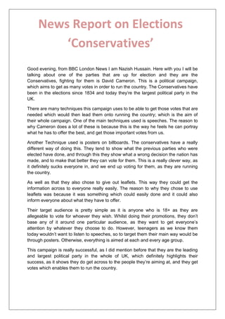 The Conservatives, led by David Cameron, are campaigning in the upcoming UK elections. Their goal is to get enough votes to run the country. Their campaign uses techniques like speeches from Cameron and posters highlighting the failures of previous governments to convince voters to support the Conservatives. They also distribute leaflets with information about their platform. While their target audience is all eligible voters age 18+, they tailor some techniques like posters more toward younger audiences. The Conservatives' success in past elections, becoming the largest UK political party, shows their campaign strategies are effective at reaching voters and securing votes.