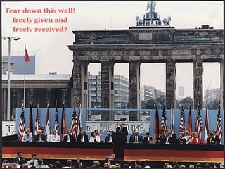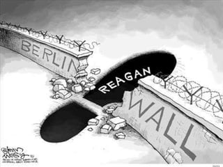 The document provides background information on the rise of conservatism in the United States during the late 1970s and 1980s. It discusses how Ronald Reagan appealed to conservative voters who were frustrated with the economy and foreign policy. Reagan was elected president in 1980 on a platform of tax cuts, increased military spending, and limited government. As president, Reagan implemented economic and foreign policies aimed at reducing the size and role of government.