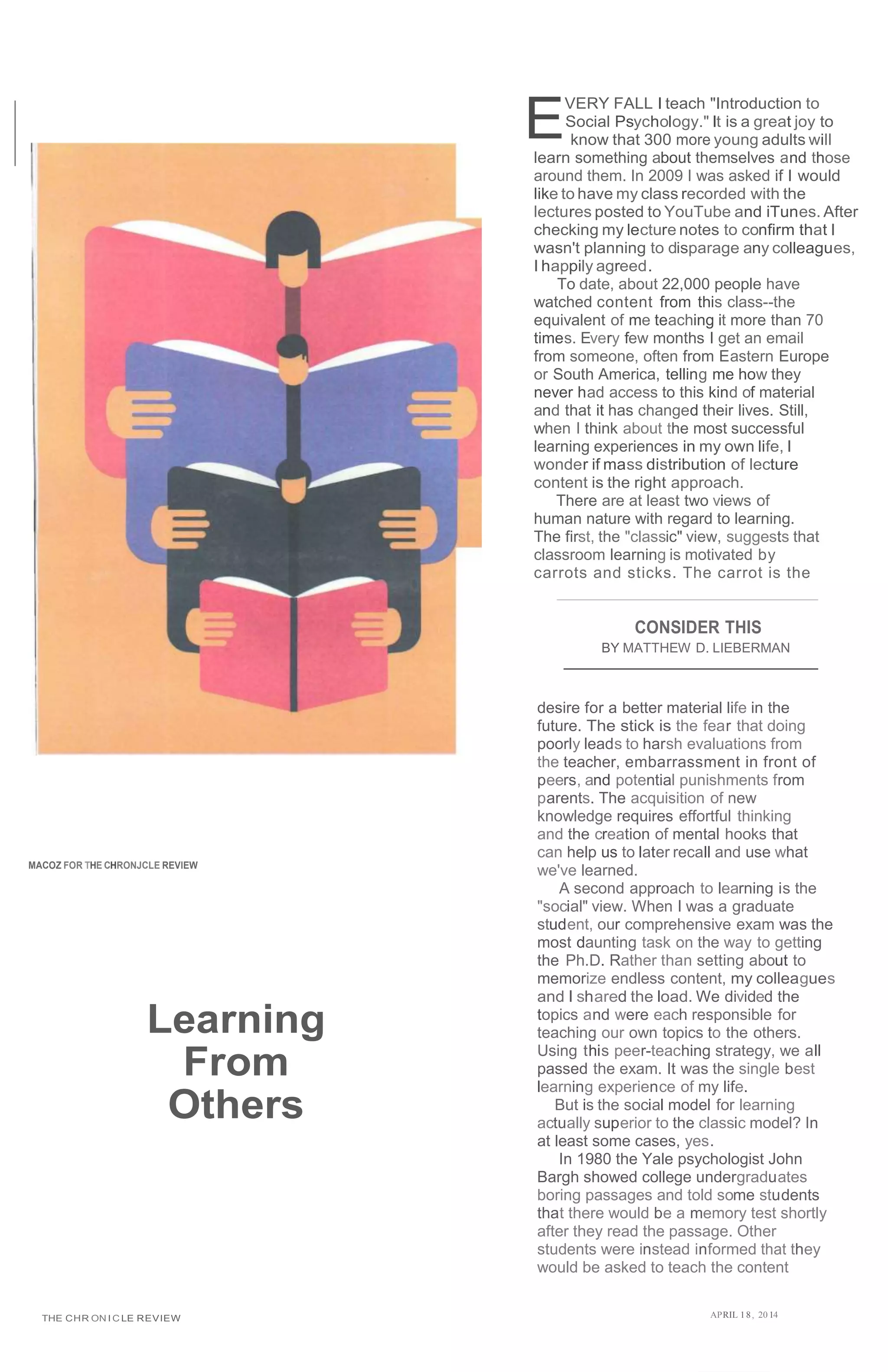 The document discusses two views of human learning - the classic view which sees learning as motivated by rewards and punishments, and the social view which sees learning as enhanced through social interactions and teaching others. Research shows the social view of learning is actually superior in some cases. While MOOCs are based on the classic view of individual learning, technologies like Edmodo that facilitate social learning online have shown more success by activating the brain's natural social learning abilities. Embracing the social aspects of learning through technology may be a better approach than trying to replicate classroom learning digitally.