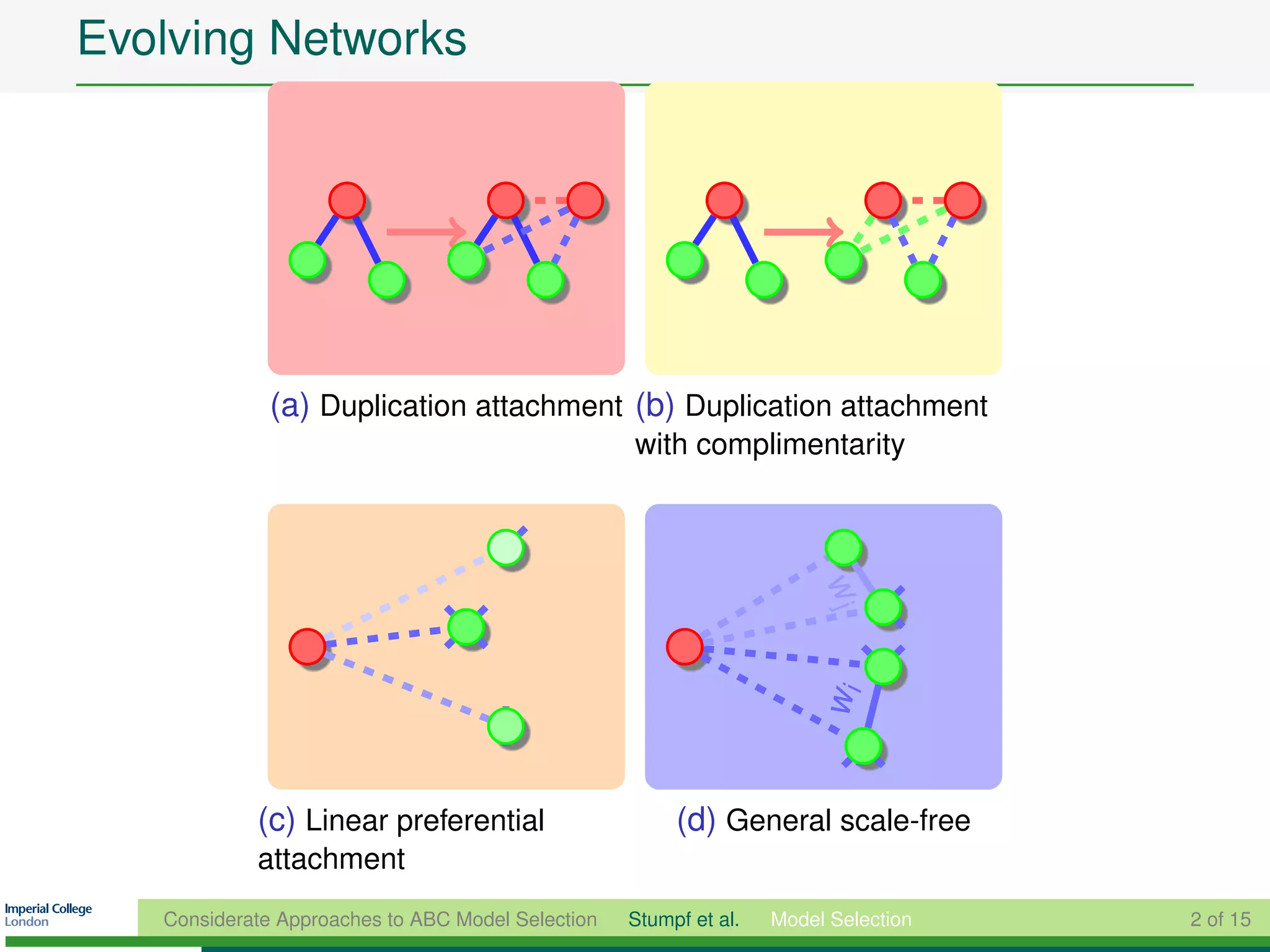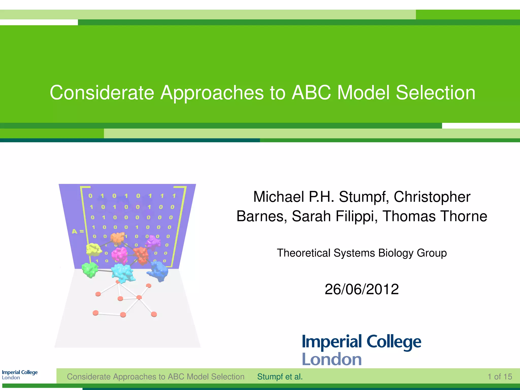 The document discusses using approximate Bayesian computation (ABC) for model selection when directly evaluating likelihoods is computationally intractable, noting that ABC involves simulating data from models and comparing simulated and observed summary statistics, and that constructing minimally sufficient summary statistics is important for accurate ABC model selection.