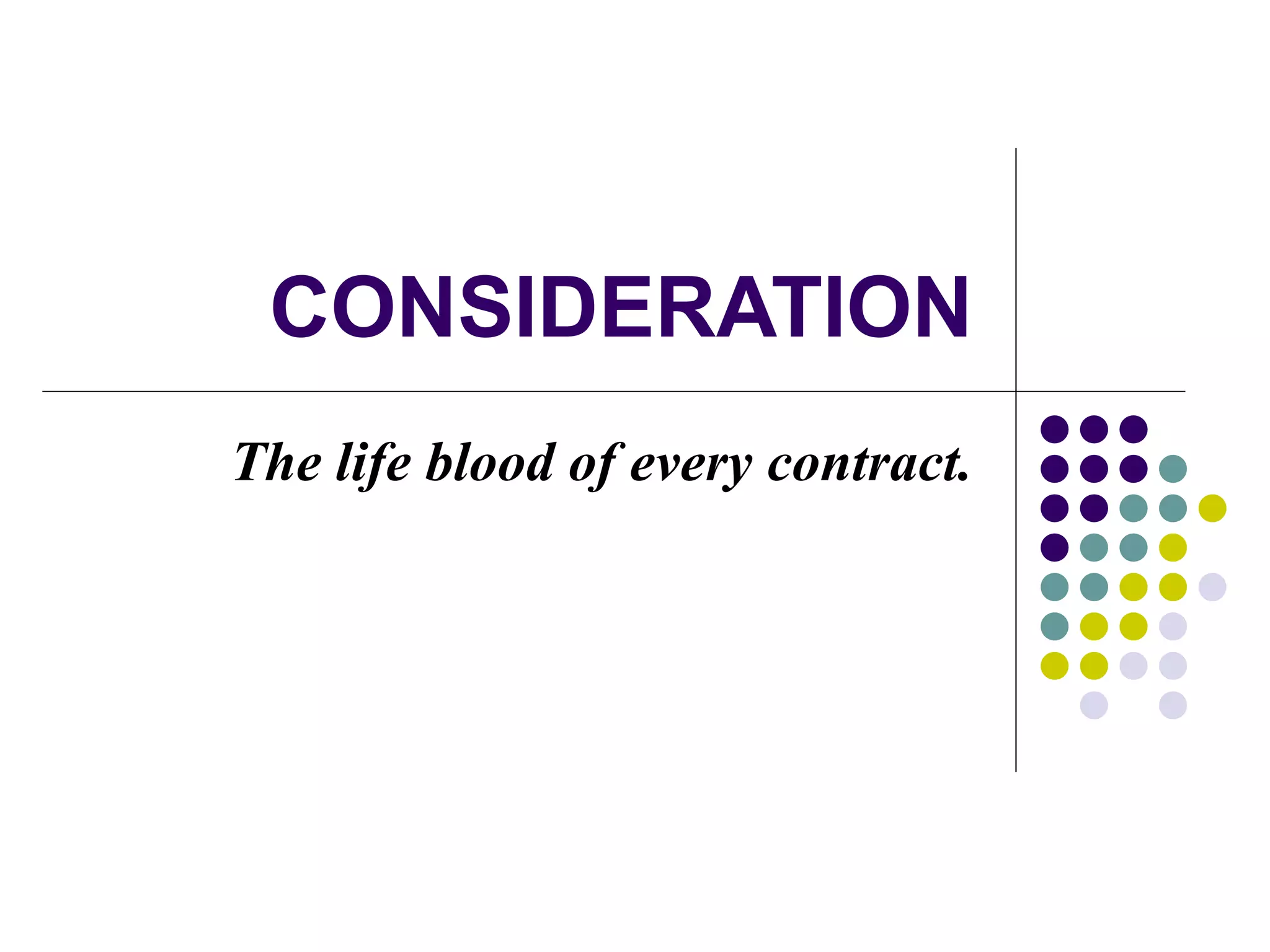 Consideration is something of value that is exchanged between parties to a contract. It is essential for a valid contract. Consideration can be in the form of an act, abstinence from an act, or a promise. It must be something that moves from the promisee at the desire of the promisor. Consideration does not need to be adequate, but it must be real, lawful, and not something the promisor is already obligated to do. Without consideration, there is no valid contract, though there are some exceptions such as natural love and affection or compensation for voluntary services.