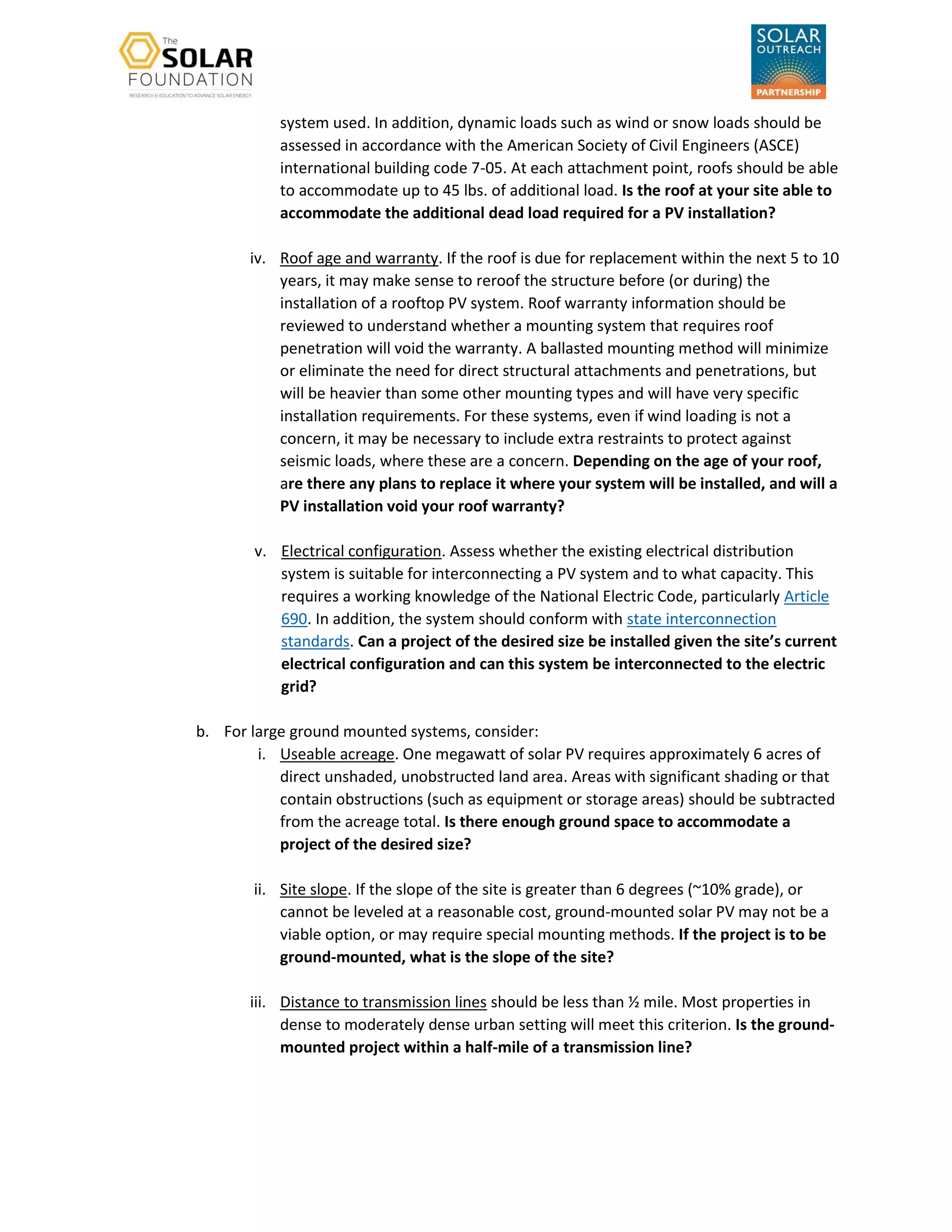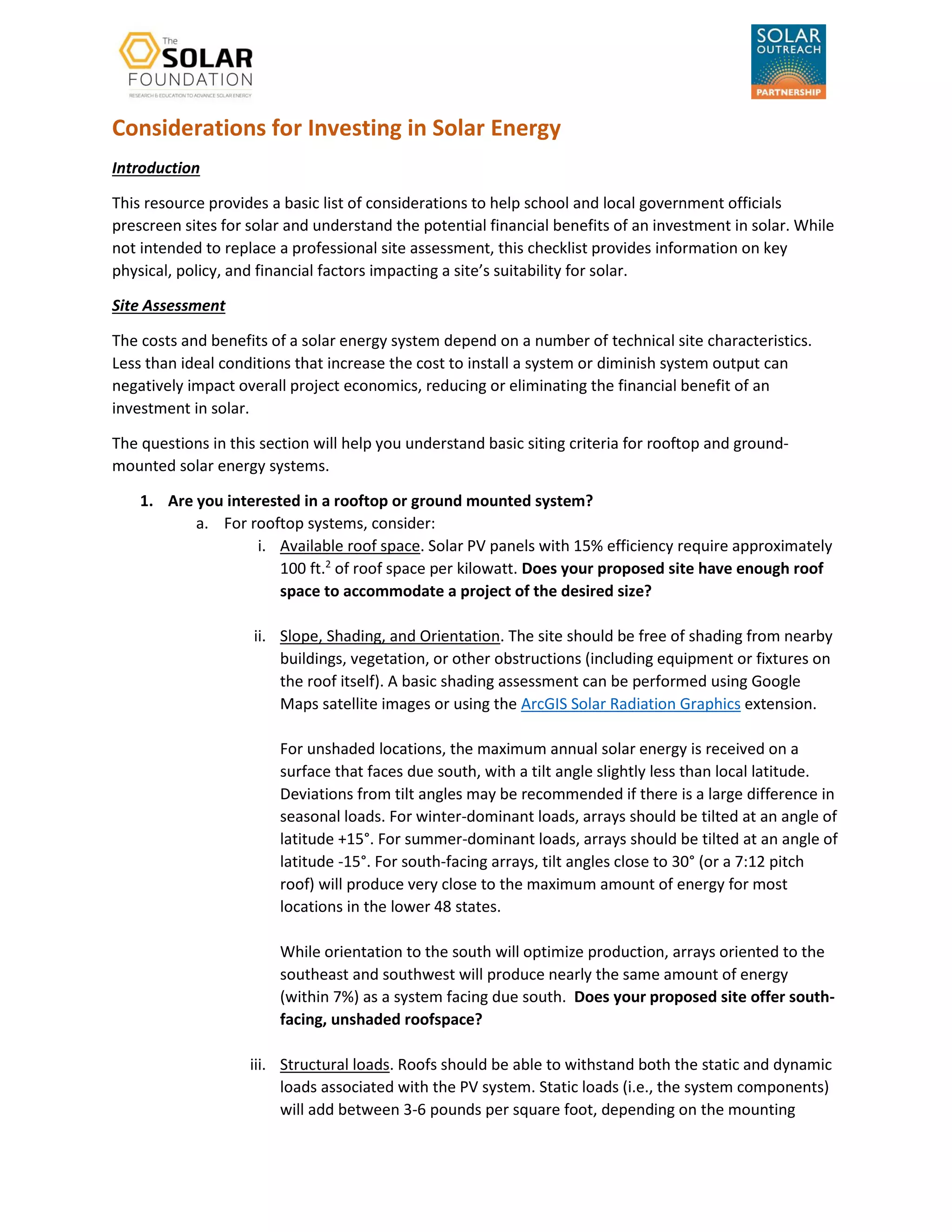This document provides guidelines for school and local government officials to assess the suitability of sites for solar energy investments, covering technical, policy, and financial considerations. It includes criteria for both rooftop and ground-mounted systems, such as site characteristics, electrical configuration, and financial assessments, including state incentives and ownership structures. The resource emphasizes the importance of understanding site-specific conditions and financial implications to maximize the benefits of solar energy installations.