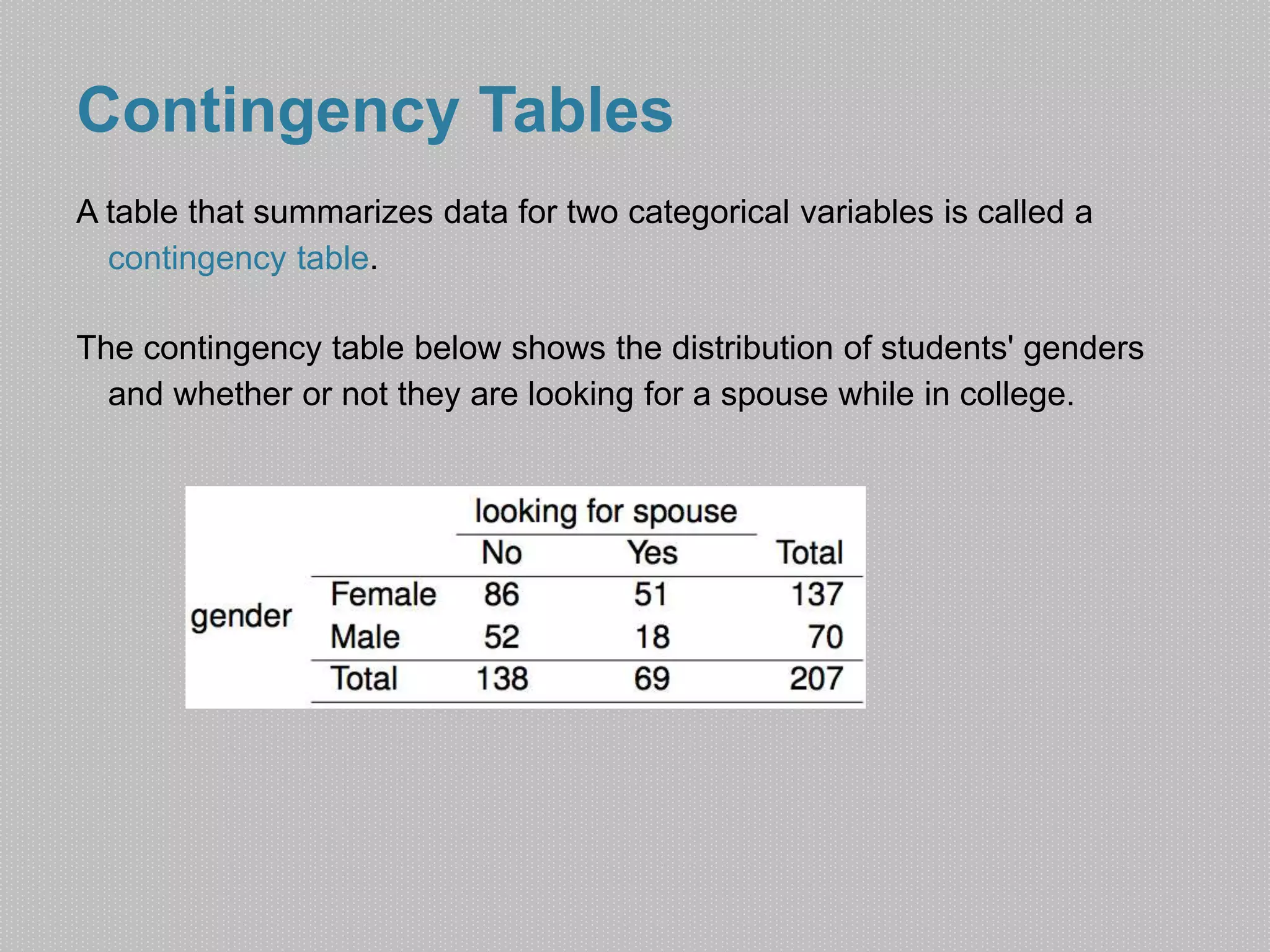 This document discusses different ways to visualize categorical data, including contingency tables, bar plots, segmented bar plots, mosaic plots, and pie charts. It provides examples of how to use contingency tables to show the relationship between two categorical variables, and explains the differences between bar plots and histograms. Guidelines are given for choosing the appropriate proportion to examine when looking for a relationship between categorical variables. Finally, it notes some limitations of pie charts for comparing data across groups.