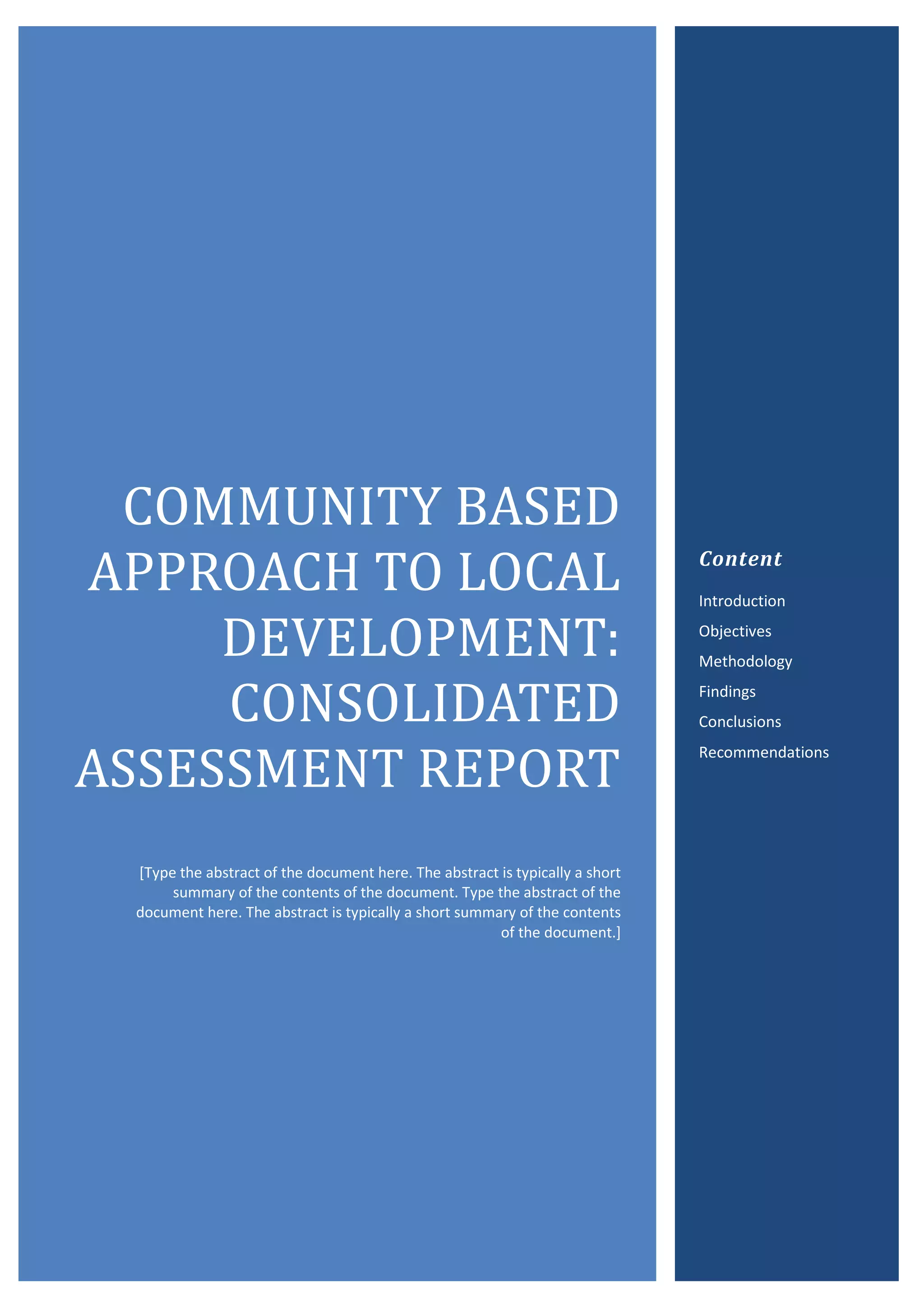 This document presents a consolidated assessment report on the Community Based Approach to Local Development Project implemented in Ukraine from 2007-2011. The Project aimed to improve living conditions in rural and semi-urban areas by promoting community-based initiatives and local governance. It established support structures that brought together local communities, councils, and authorities. Surveys found the approach strengthened self-governance and decision-making while improving infrastructure, services, and social cohesion. Over 1.2 million citizens benefited from community projects. The report recommends continuing the process and structures under a national framework to sustainably develop local communities in Ukraine.