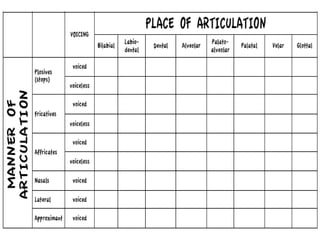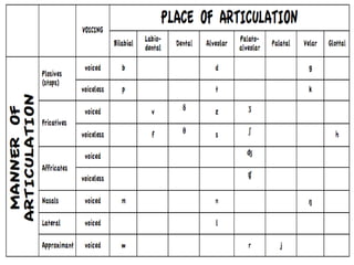 The document describes the classification of English consonants according to place and manner of articulation. It discusses the different places where consonants can be articulated in the mouth, including bilabial, labiodental, dental, alveolar, palatal, velar, and glottal. It also describes the different manners of articulation such as plosives, fricatives, nasals, approximants, lateral, and affricates. The document provides examples of consonants that fall into each place and manner category.
