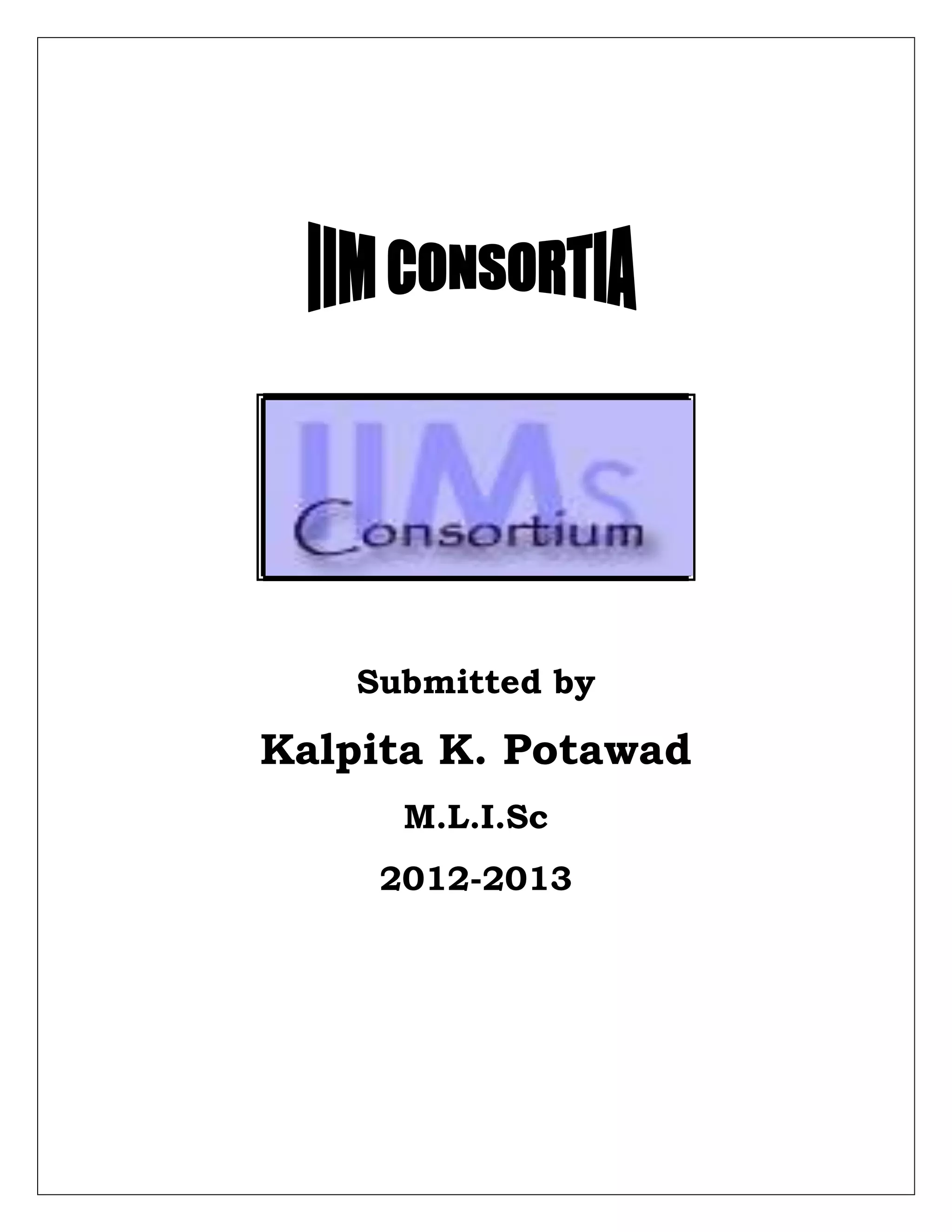 The document discusses the Indian Institute of Management (IIM) Library Consortium. It defines a consortium as groups coming together to achieve a combined objective requiring cooperation and shared resources. The IIM Library Consortium was formed to allow the six IIM institutions to share collections and services. Key issues addressed by the consortium include selecting a coordinating agency, identifying funding sources, negotiating with publishers, and ensuring access to resources. The consortium has been successful in providing shared access to databases and journals.