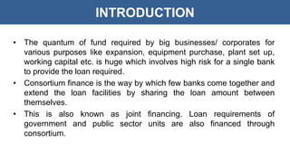 Consortium finance is a collaborative loan approach where multiple banks unite to provide large loan amounts required by big businesses, minimizing risk for individual banks. The process involves discussions among member banks, appointing a lead bank to coordinate the financing, and regular evaluations of loan performance. The lead bank plays a crucial role in ensuring proper documentation, fund sanctioning, and communication between banks about the borrower's conduct.