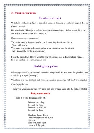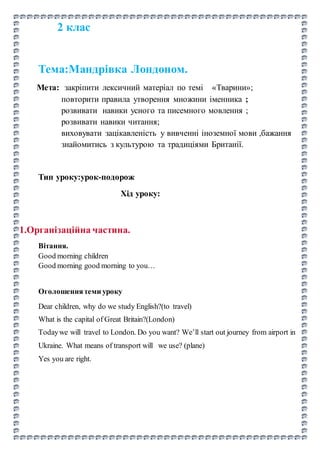This document outlines a lesson plan for a 2nd grade Ukrainian class about traveling to London, England. The objectives are to reinforce animal vocabulary, practice plural nouns, improve oral and written English skills, and foster interest in learning English and British culture. The lesson involves "traveling" to famous London locations like Heathrow Airport, Buckingham Palace, the Tower of London, the Houses of Parliament, and Regent's Park. At each stop the students must complete a task like sounds practice, reading comprehension, or animal vocabulary before "entering". The lesson aims to teach through interactive role-playing games and physical activities at each site.