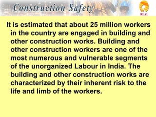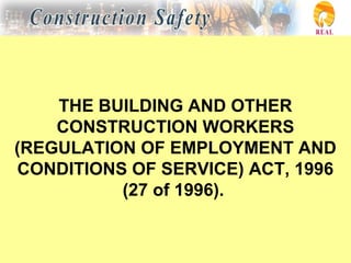 This document summarizes The Building and Other Construction Workers (Regulation of Employment and Conditions of Service) Act, 1996 which was enacted to regulate the employment and working conditions of building and construction workers in India. It notes that around 25 million workers are employed in the industry, which is characterized by risks to life and limb as well as casual employment, uncertain hours, and lack of welfare facilities. The Act aims to improve safety, health and welfare measures for construction workers by mandating safety committees, accident reporting, and employer responsibility for compliance with safety provisions. It defines key terms like "building worker", "construction work", and "contractor".