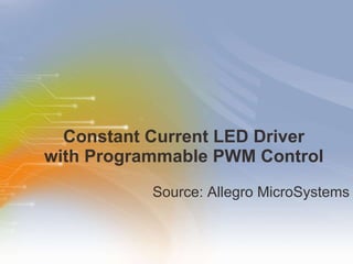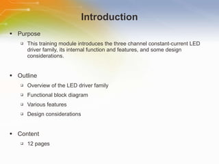 This document introduces the three-channel constant-current LED driver family from Allegro Microsystems, detailing its internal functions, features, and design considerations. Key features include programmable PWM control, various brightness and dot correction settings, and protection mechanisms like thermal shutdown and undervoltage lockout. It also outlines the operational parameters and design resources for the A6280 and A6281 LED driver models.